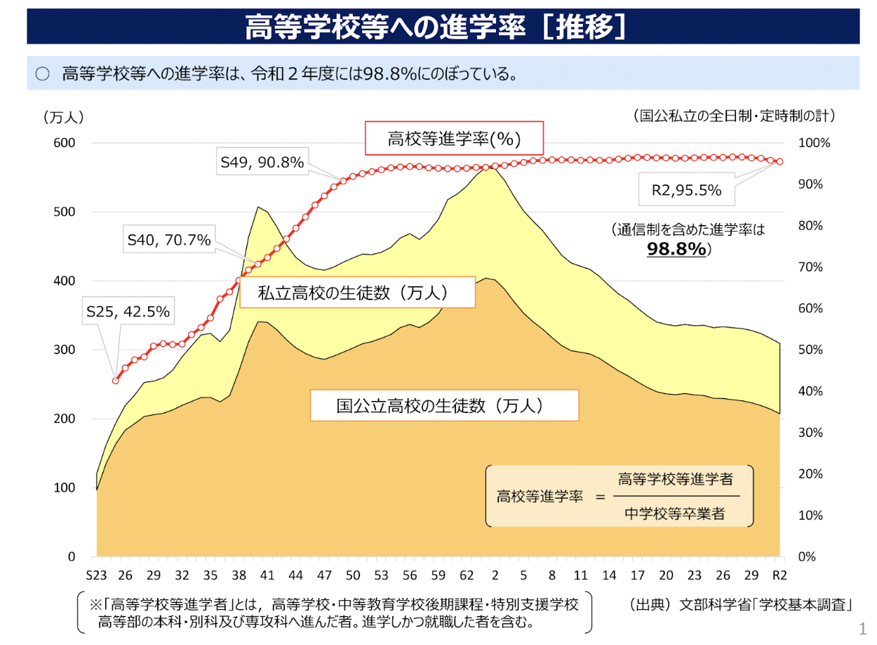 文部科学省が公開する「高等学校教育の現状について(令和3年3月)」によると、高等学校への進学率は、令和2年度時点で98.8%という結果が出ています。ほとんどの中卒者は高等学校への進学を選択しているようです。