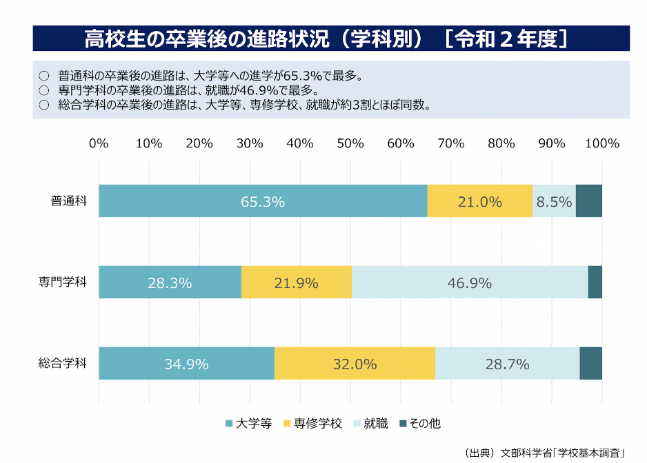 一方、専門学科や総合学科では、大学等への進学者は全体の約3割~4割となっていて、専門学科は約5割の生徒が卒業後の進路として就職を選択しています。総合学科は、大学等進学者がやや多いものの、大学等、専修学校、就職が約3割とほぼほぼ同数となりました。