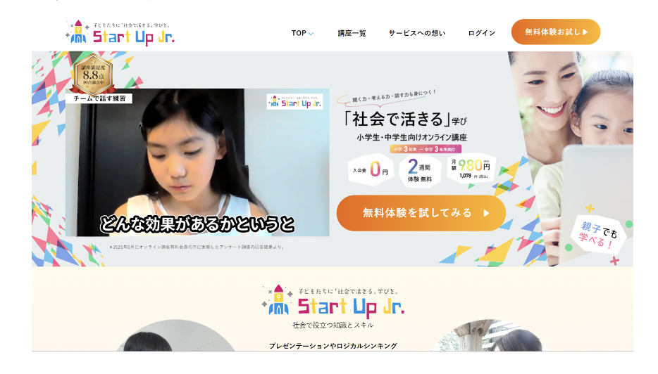 スタートアップジュニアは、社会で活きる学びを得られる小中学生を対象にしたオンライン講座です。月額980円(税別)の価格で受けることが可能です。プレゼンテーションやロジカルシンキング、経済や社会の仕組みなどが学べます。