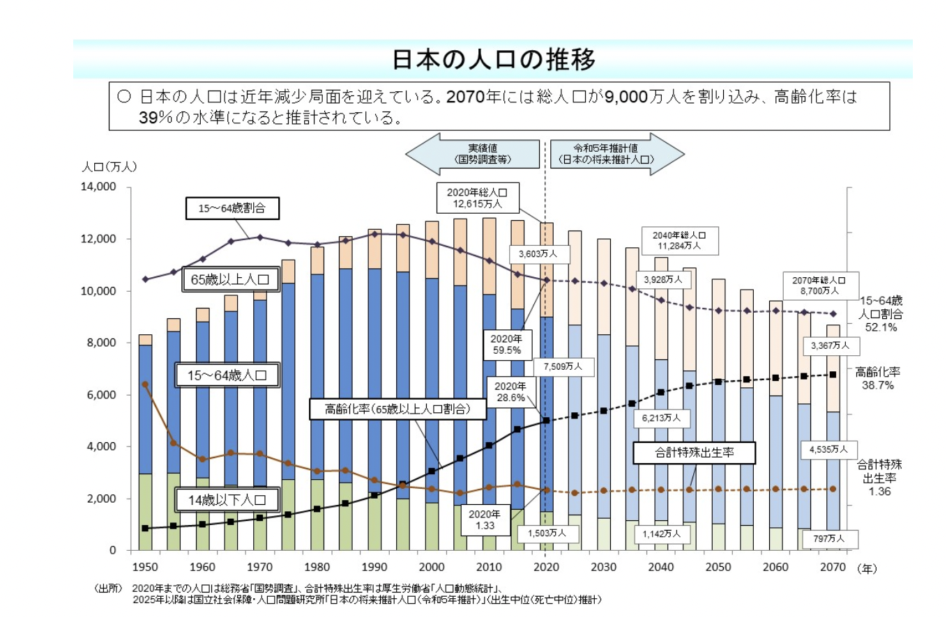 グラフは厚生労働省が公表した「日本の人口の推移」です。このままのペースで少子高齢化が続くと、日本の高齢化率は2070年には39%になるといわれています。大家族世帯の減少もあり、介護系の職業へのニーズはますます高まっていくでしょう。