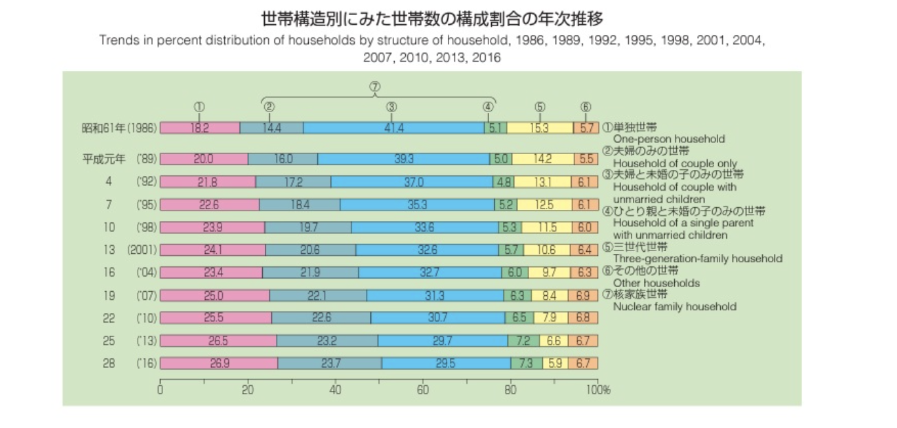 グラフは世帯構造別の世帯数の推移を表したものです。夫婦のみ・夫婦とその子どものみの「核家族世帯」は増え続け、三世代世帯(大家族世帯)は減り続けています。