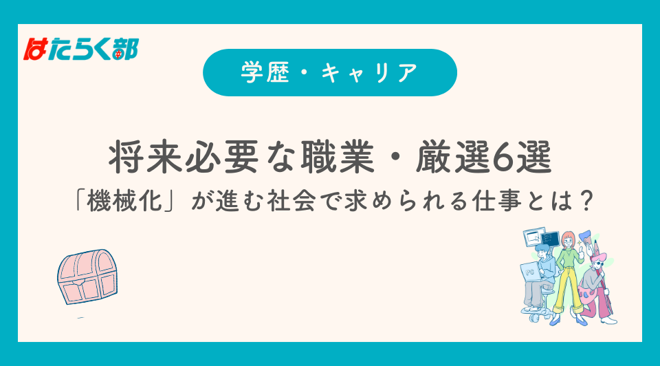 将来必要な職業を6つ紹介します。それぞれなぜ必要なのか、社会の流れやテクノロジーの進化などの視点から解説します。具体的な仕事内容や、各職業で将来どんな人材が必要となるのかもお伝えするので、仕事選びの参考になるでしょう。将来にわたってひとつの仕事を極めたいと考えている人、仕事選びの軸が「安定性」だという人は参考にしてみてください。