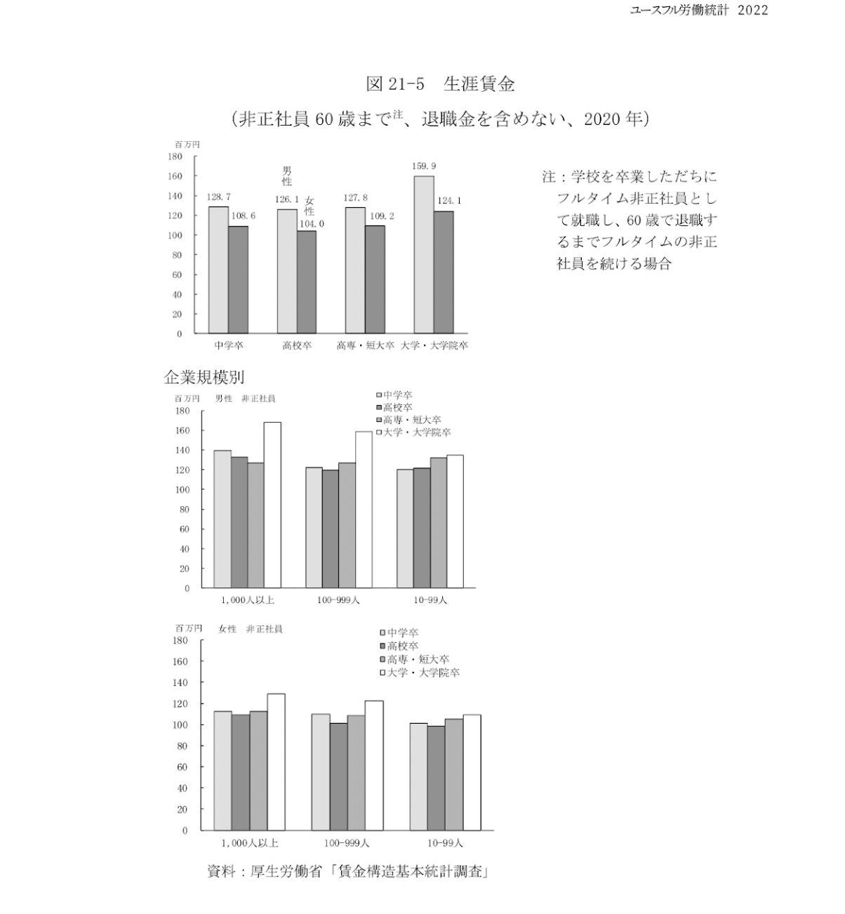 (引用:21 生涯賃金など生涯に関する指標|ユースフル労働統計 2022 (jil.go.jp))