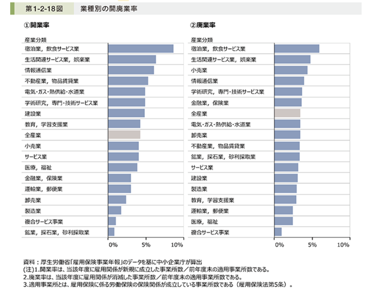 こちらのグラフは2021年の開業率と廃業率について、産業別にまとめたものです。特に「小売業」は開業率に対して廃業率が高く、「医療、福祉」は開業率に対して廃業率が低いです。