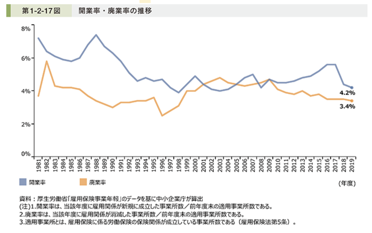 こちらのグラフは日本の開業率と廃業率の推移を示しています。所々増減はあるものの、全体として開業率は右肩下がり、廃業率は一定であるといえるでしょう。