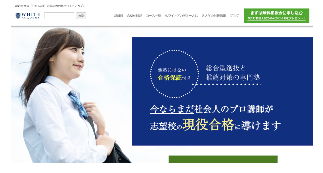 総合型選抜対策におすすめな塾5つ目は、ホワイトアカデミー高等学部です。ホワイトアカデミー高等学部は新宿に校舎を構え、対面指導と全国どこでも受けられるオンライン指導を実施しています。