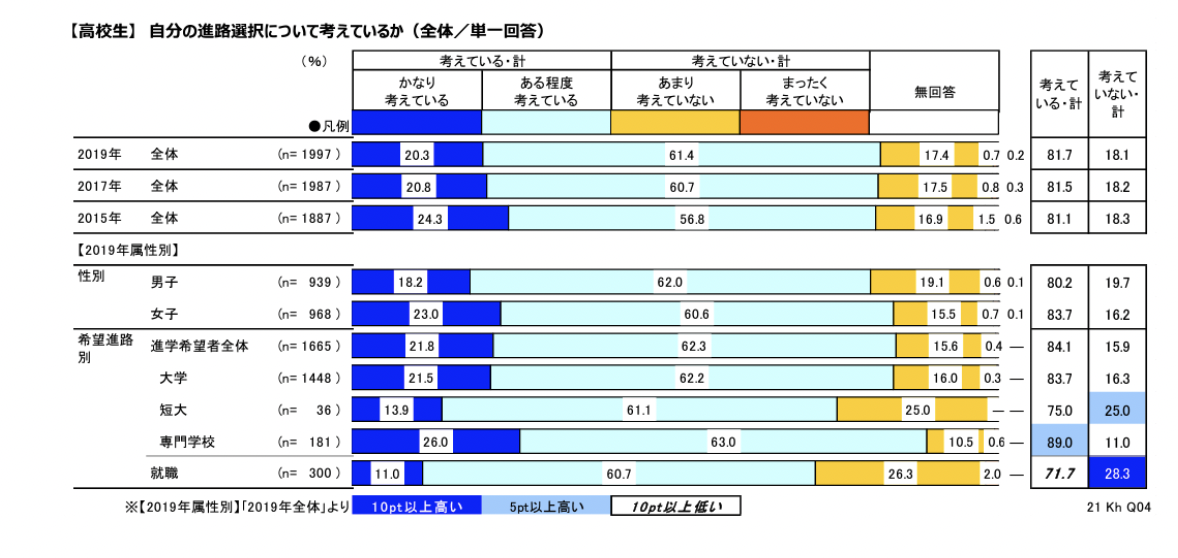 進路について考えている人は全体の82%という結果でした。高校2年生になると進路への意識・関心は高まってくることが分かります。