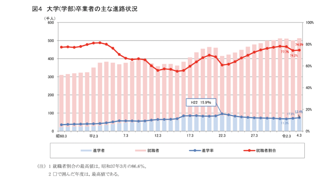 高校生や大学生が卒業後にどんな進路を選択しているのか、文部科学省が毎年実施している「学校基本調査」令和4年度の資料を参考にみていきます。