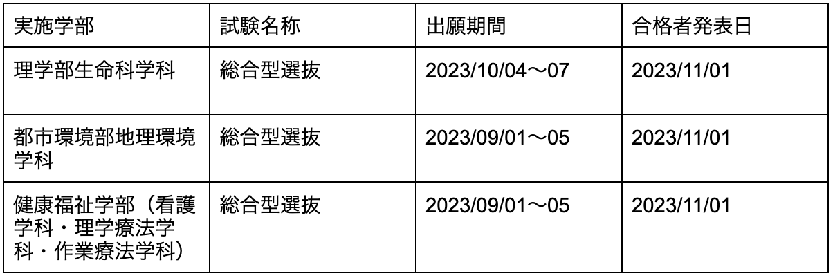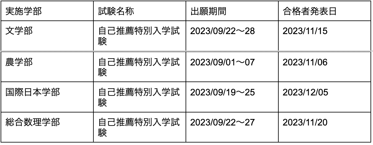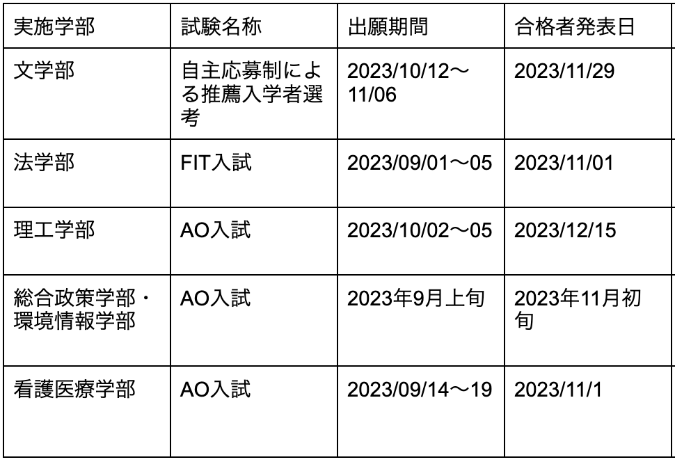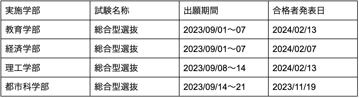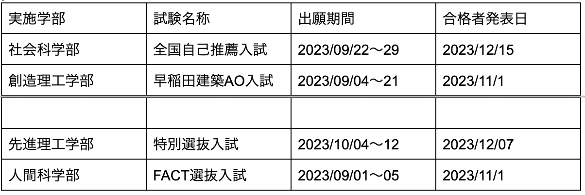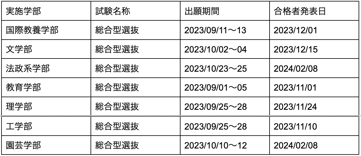 以下は、すべて2023年の受験スケジュールです。日程や内容が変更になるということもゼロではありませんので、最新の情報は、各大学からの発信を見逃さないようにしてください。