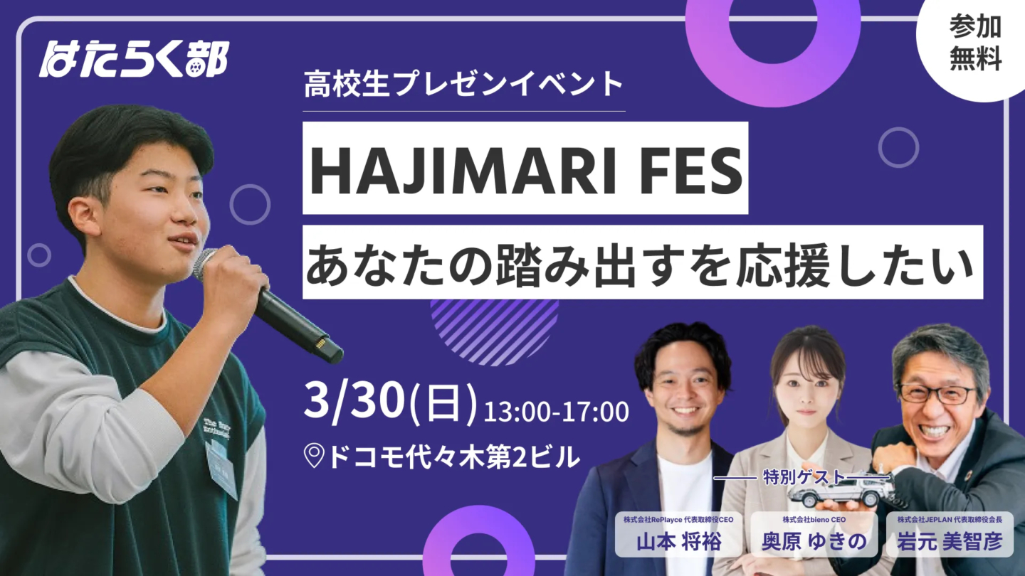 中高生向けキャリア探究サービスを運営する株式会社RePlayce(本社:東京都渋谷区 代表取締役CEO 山本将裕 以下RePlayce)は、3月30日(日)13時より、ドコモ代々木第二ビルにて中高生100名以上の中から選ばれた10チームによるプレゼン大会「HAJIMARI FES 2025」を開催いたします。