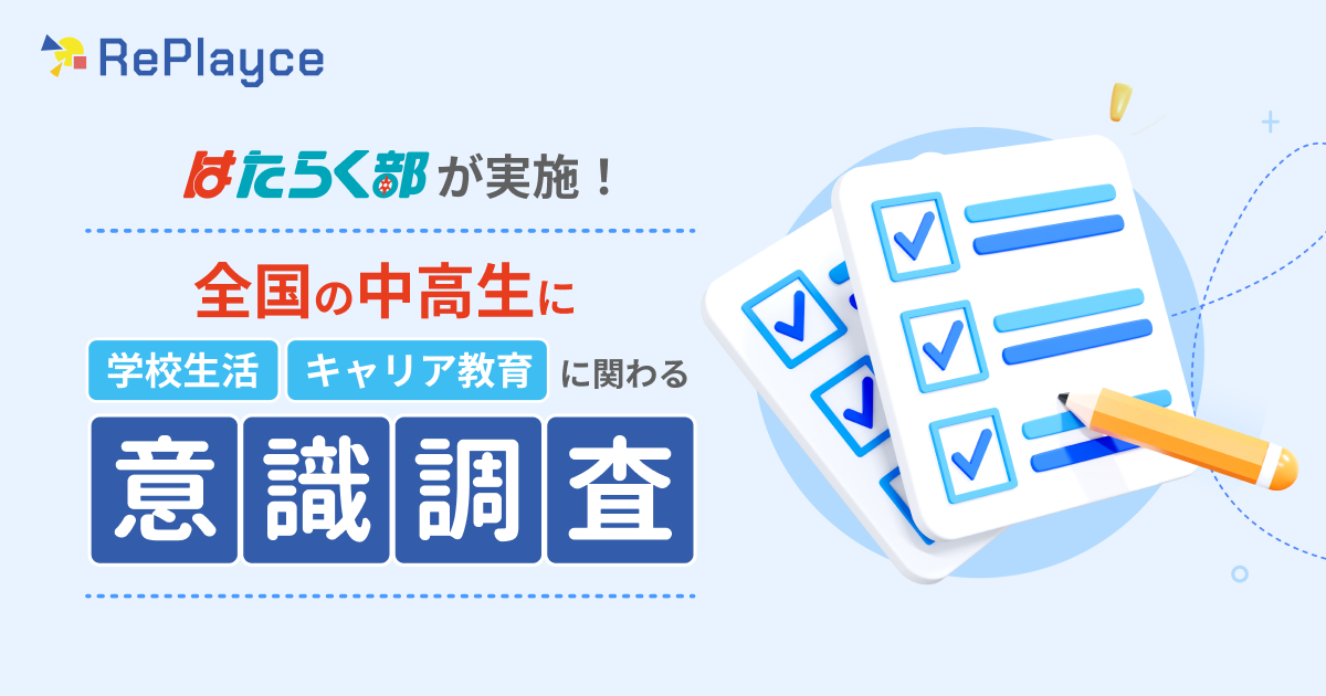 中高校生向けキャリア教育事業「はたらく部」を運営する株式会社RePlayceは、全国に住む中高生の意識と実態を明らかにするため、「学校生活・キャリア教育に関わる意識調査」を行いましたので、ご報告いたします。