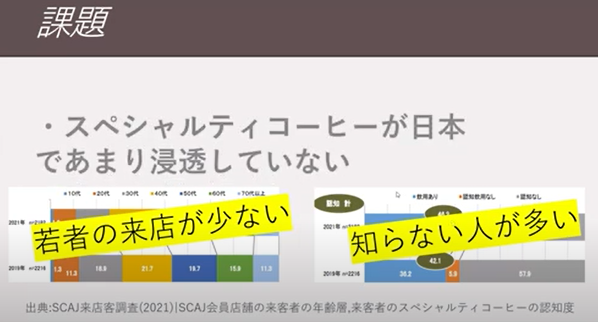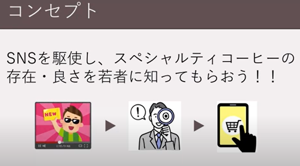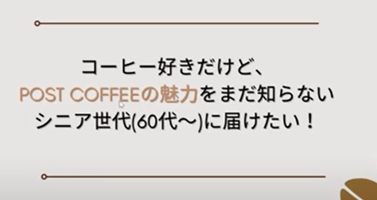 まずは課題感を提示し、若者の来店が少ないこと・スペシャルティコーヒーを知らない人が多いことをふまえ、ターゲットをZ世代に設定。