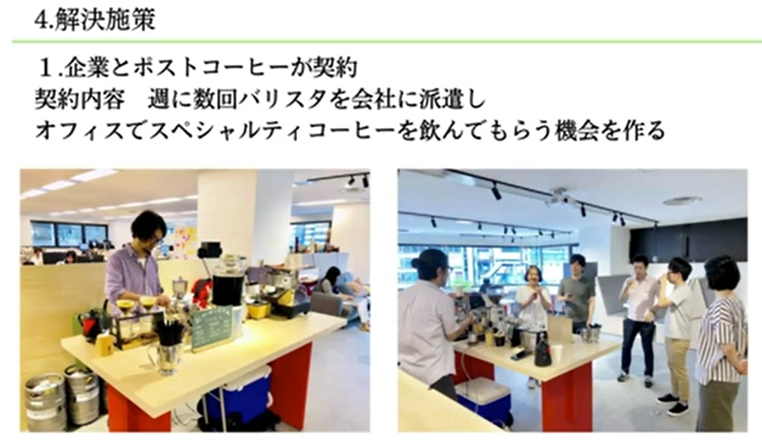 課題解決策としては、職場でスペシャルティコーヒーを提供することが認知を広げるのに効果的、と提案しました。