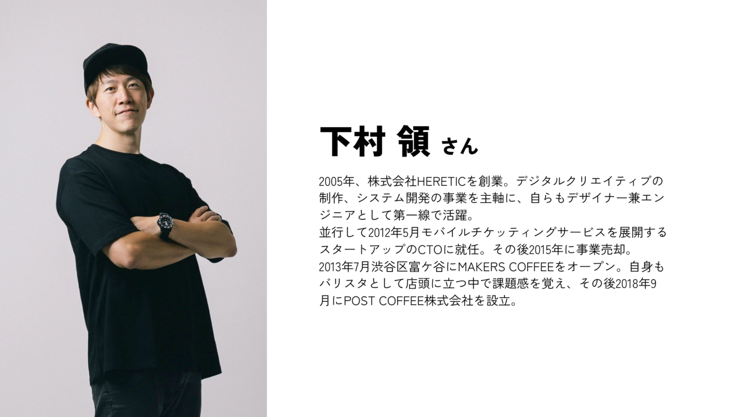 本コースにご協力いただいたのは、日本最大級の高品質コーヒー専門ECサイト「Post Coffee」の代表取締役CEOの下村さん。