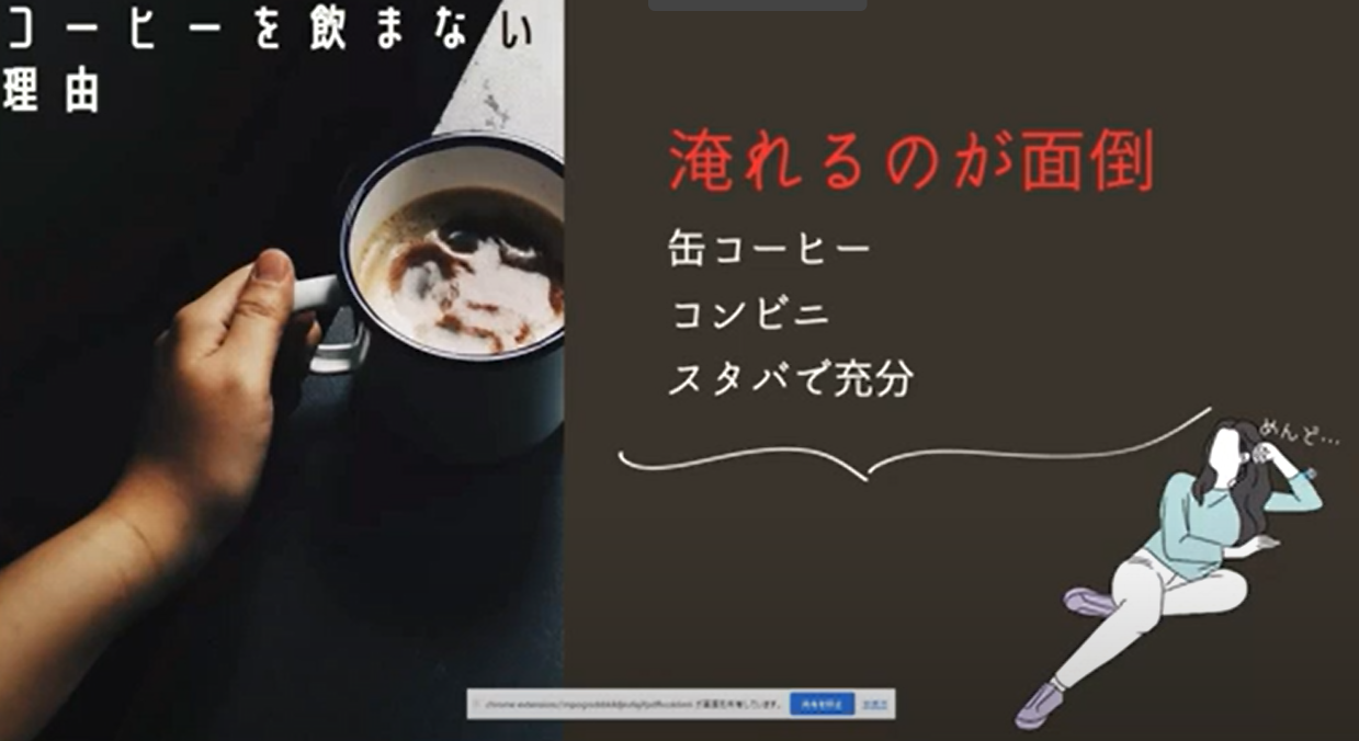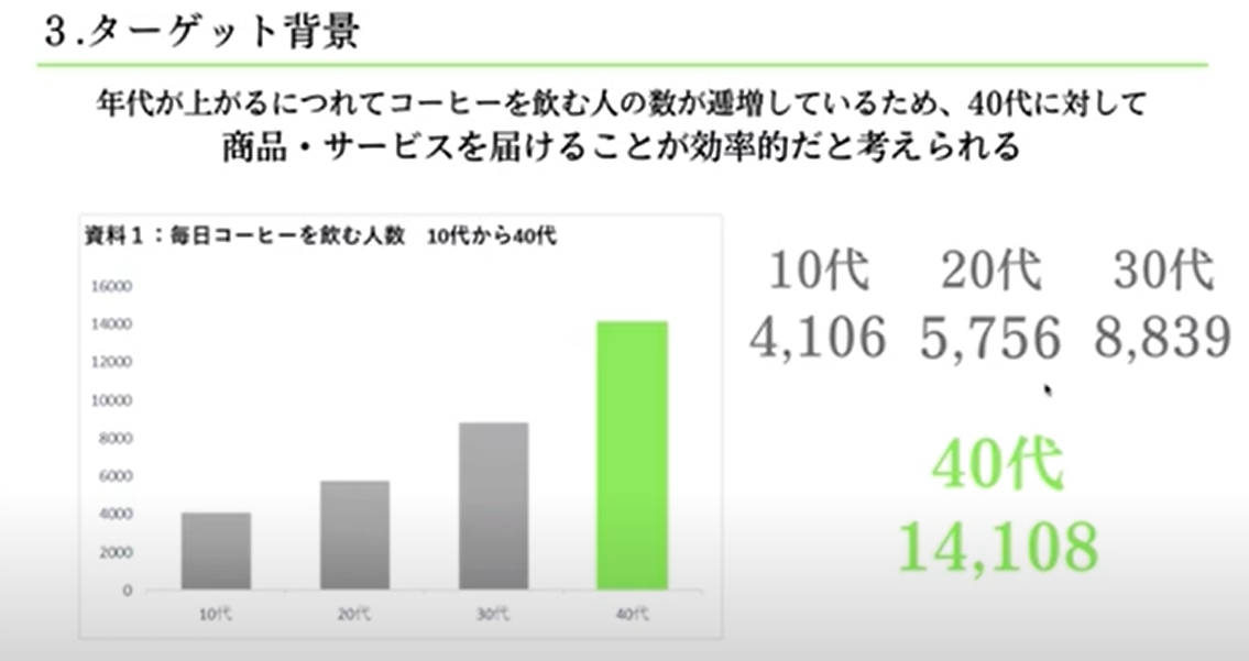 どの年代が、どんなコーヒーが好きなのか?その根拠は何か?など、提案に移る前に背景から丁寧に述べました。