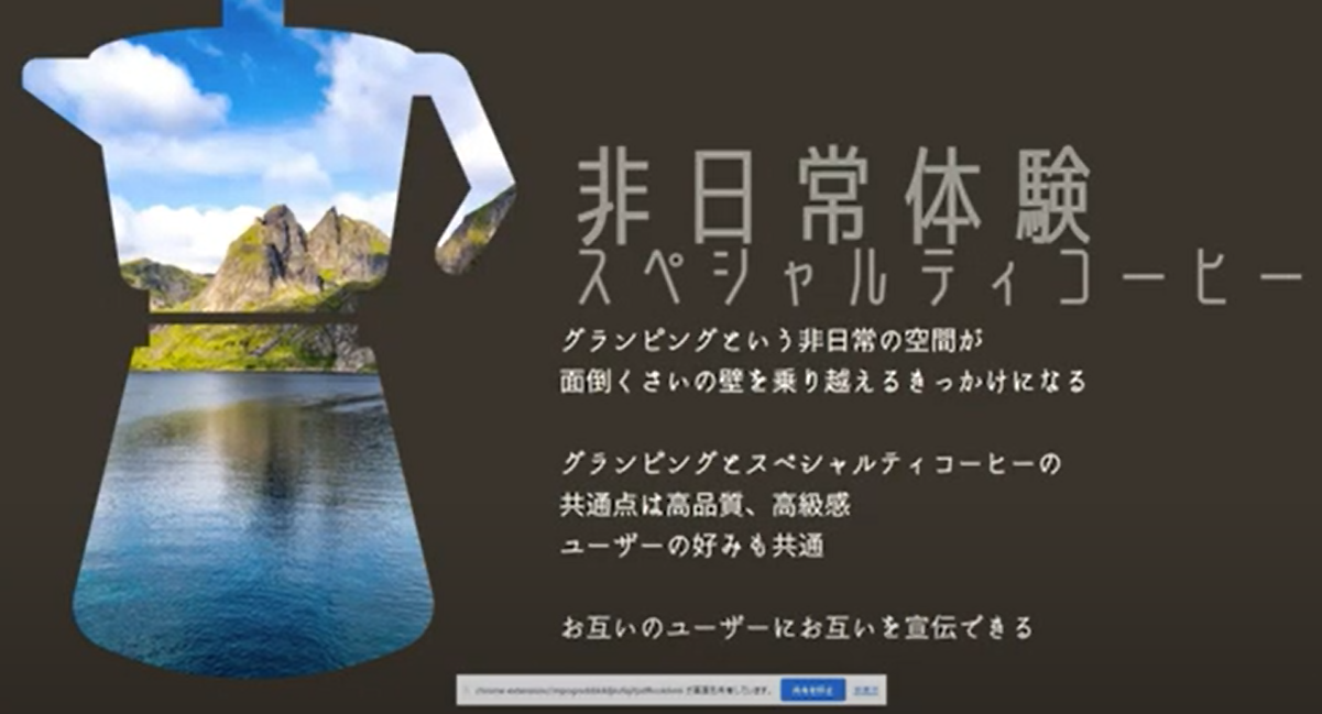 アウトドアでの活用を提案したチーム、セグメントがグランピング×スペシャルティコーヒーで高品質・高級感とつなげているのが良いと思いました。