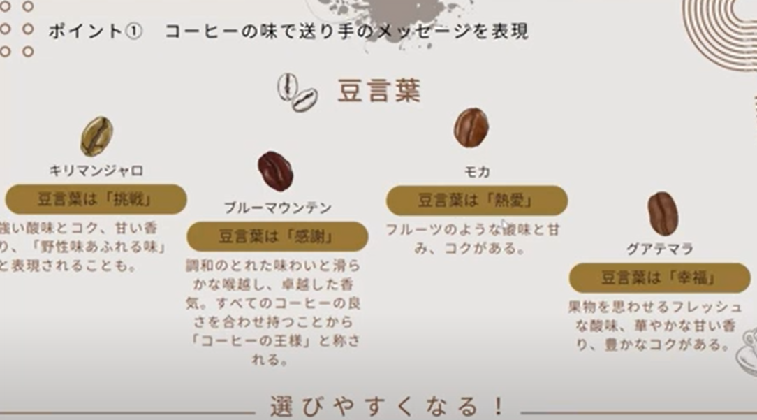 「送ってあげたい」と「もらってうれしい」のニーズをふまえ、メッセージ性あるギフトとしてのポイントを2つ提案。ひとつめは、コーヒーの味で送り手のメッセージを表現。ふたつめは、QRコードでメッセージ動画を表示すること。「花言葉」のように「豆言葉」を表現するなど、工夫をしました。