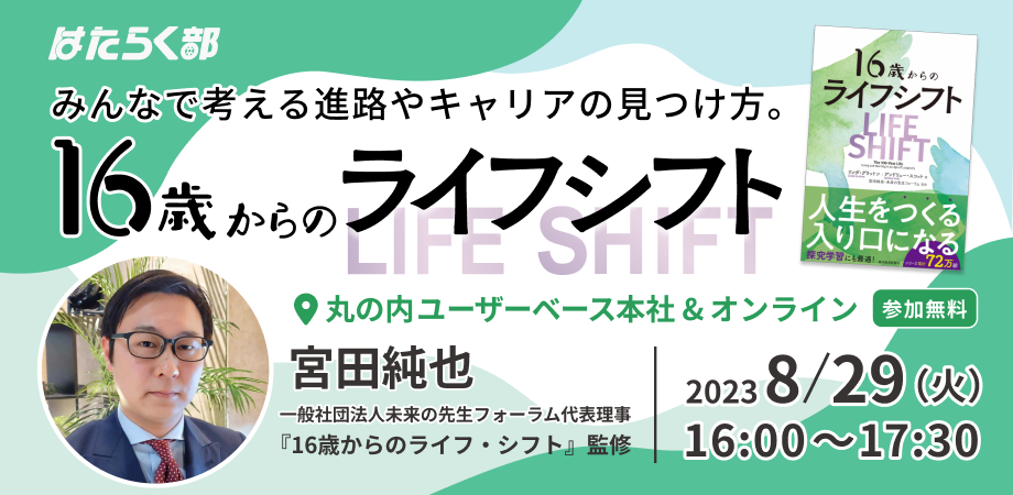 2023年8月9日に発売された『16歳からのライフ・シフト』は、シリーズ累計72万部の「100年人生」の一大ムーブメントを巻き起こした『ライフ・シフト』の待望の高校生版です。監修は、一般社団法人 未来の先生フォーラム代表理事の宮田純也氏。中高生向けキャリア教育を展開する「はたらく部」は、宮田氏と現役高校生とともに、「みんなで考える進路やキャリアの見つけ方。16歳からのライフシフト」を開催します。